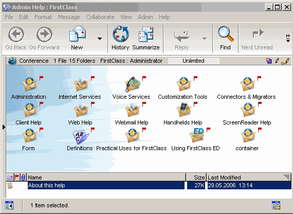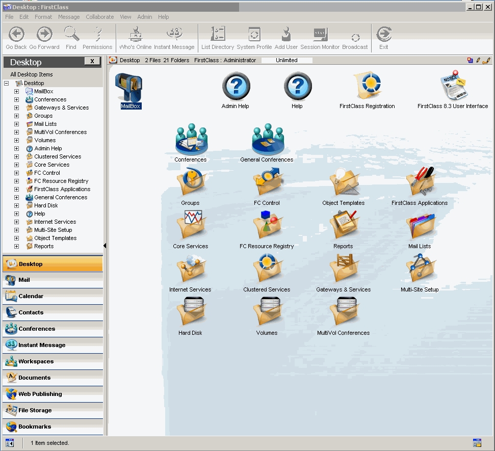 Nun sind Sie als Administrator mit Ihrem FirstClass Server verbunden und sehen den Administrator Desktop: