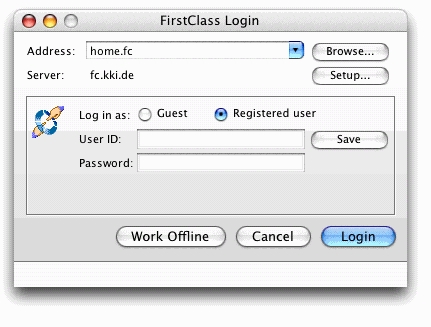 Inbetriebnahme und Konfiguration des ServersNach der Installation der Serversoftware, müssen Sie, sofern nicht schon geschehen, den FirstClass Client installieren. Dies sollte auf jeden Fall auf dem Rechner sein, auf dem der FirstClass Server läuft. Außerdem auf allen anderen Computern im Netzwerk, von denen aus auf den FirstClass Server zugegriffen werden soll. Starten Sie nun den FirstClassServer und dann den Client. Der FirstClass Client befindet sich nach der Installation unter Programme. Wir empfehlen Ihnen ein Alias des Clients in das Dock zu legen. Nach dem Starten des Clients sehen Sie folgendes Fenster: