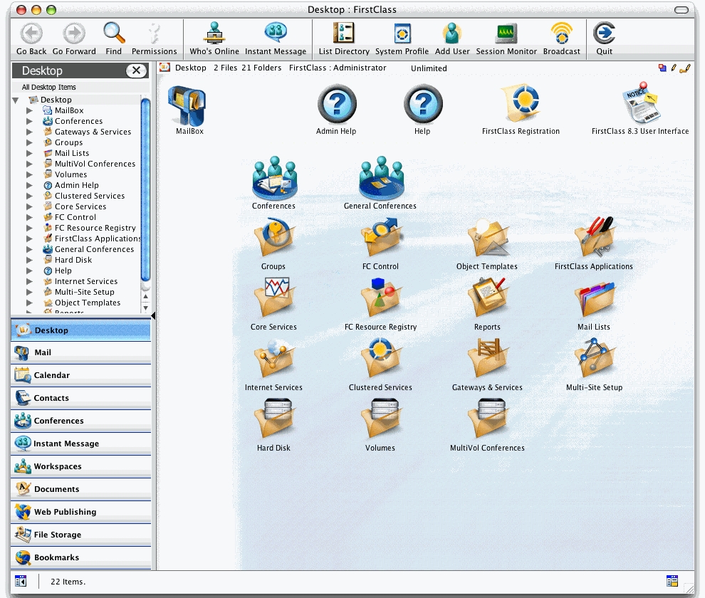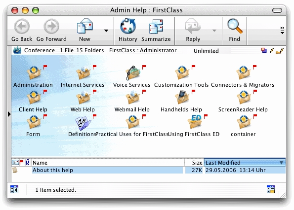 Nun sind Sie als Administrator mit Ihrem FirstClass Server verbunden und sehen den Administrator Desktop: