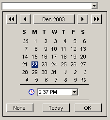 Any values that you want mapped to text. You will not normally need to put anything here. This field is only used to substitute text when specific dates are chosen from the popup calendar. It is not appropriate for calendars that include time. Type the list entries in the following format, separating each entry with a semicolon (;): text=value For example, you could substitute the text "New Year's Day" whenever users chose January 1. You need to calculate the number of seconds from January 1, 1904 to midnight, December 31 of the applicable year to arrive at the proper value. You would then type New Year's Day=seconds 0 to 86399 seconds represent January 1, 1904, 86400 to 172799 seconds represent January 2, 1904, and so on. You could also put initial instructions in the field, such as "Choose a date". You would do this by typing Choose a date=0 |
