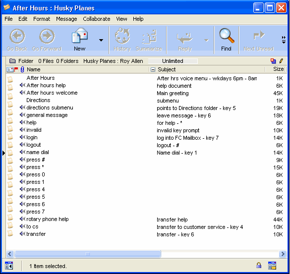 When the voice menu is complete, the Voice Greetings folder will look like this (there may be additional greetings):