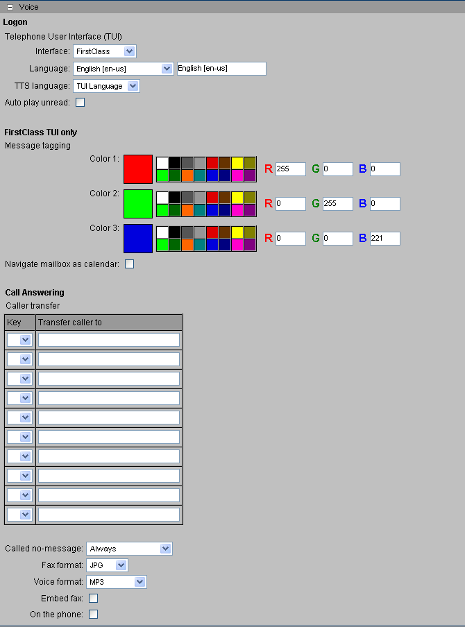 When someone calls your FirstClass Unified Communications number and you do not answer, they are transferred Voice Services. Your preferences and greetings are accessed and, based on these, the call in routed in the appropriate way. Some of these options include automatically transferring the caller to another number, playing a specific customized greeting for the caller, or playing a generic greeting for the caller and allowing the caller to leave a message.